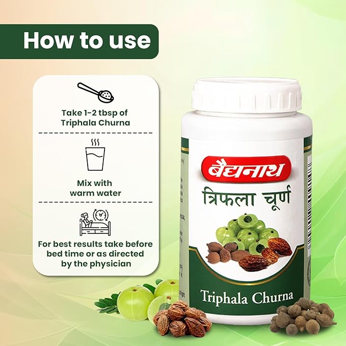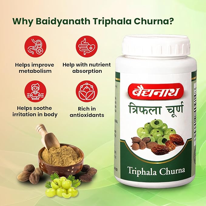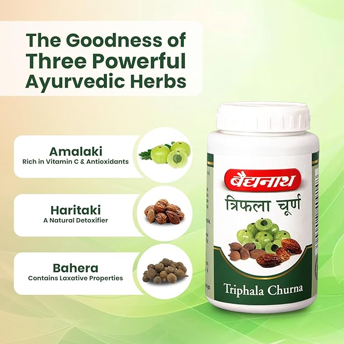 Baidyanath Triphala Churna is a traditional Ayurvedic formulation crafted to help assist in digestive health. Comprising a blend of haritaki, baheda, and amla, this churna offers natural relief from digestive issues such as constipation, gas, and indigestion. Its balanced formula may help cleanse and rejuvenate the digestive system, promoting overall well-being.