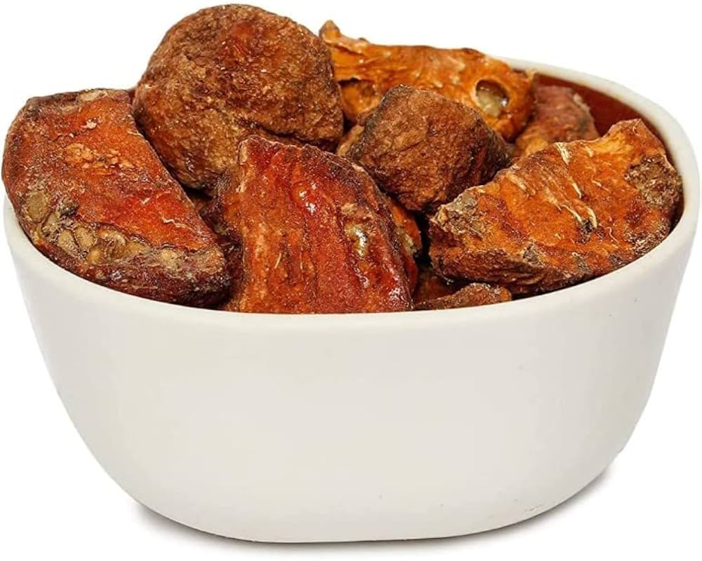The globose Bael fruits have a hard exterior and don't split open even when they are fully ripe. When the fruits are unripe, they have a greenish grey colour and a woody exterior that turns yellow. The fragrant pulp of the ripe fruit contains 10 to 15 seeds that are encased in a sac that is naturally sticky.