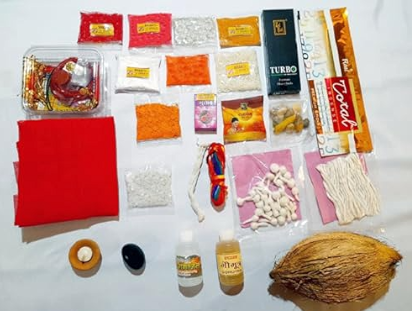Kit includes : Poster Of Bhagwan Vishnu , Shaligram Bhagwan , Lal Chunri , 16 Shringar , Copper Kalash, White Seasme Seeds , Haldi Ganth, Deepak, Pooja Batti, Kapoor, Chaane Ki Daal, Gud , Sawa Meter Lal Kapda, Dhoop, kumkum , Kalawa, Batasha, Hawan Samagri , Agarbatti, Itra, Sahad, Laung Ilachi, Katha Book.